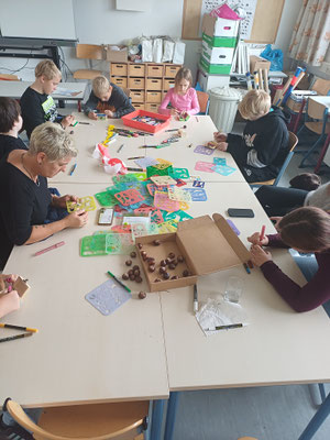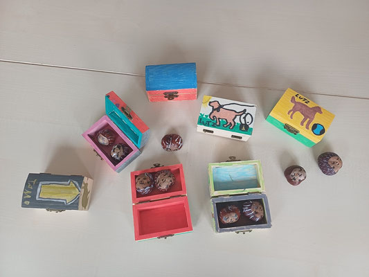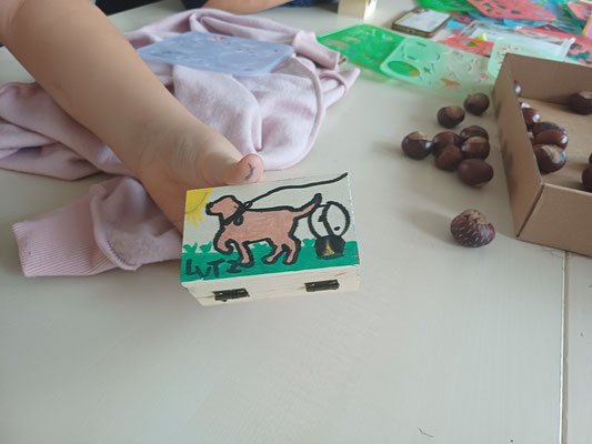 Besonders viel Spaß hatten wir beim Bemalen unserer Schatzkästchen. Mit Schablonen und Acrylfarben verzierten wir die Kästchen. Passend zum Herbst bemalten wir noch Kastanien. Aus ihnen entstanden kleine Igel, die wir in unserer Schatztruhe versteckten