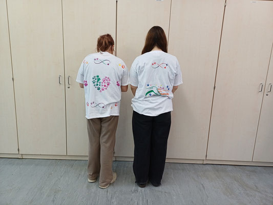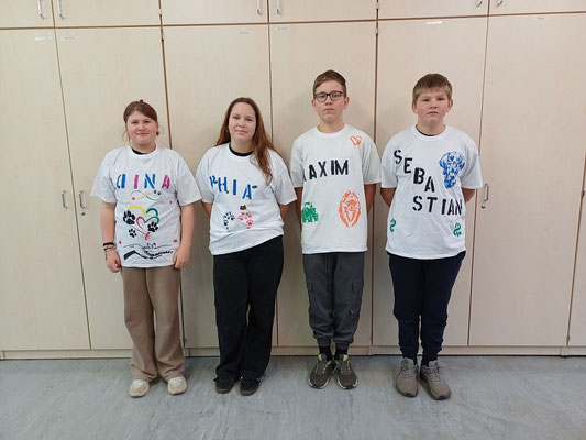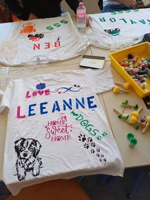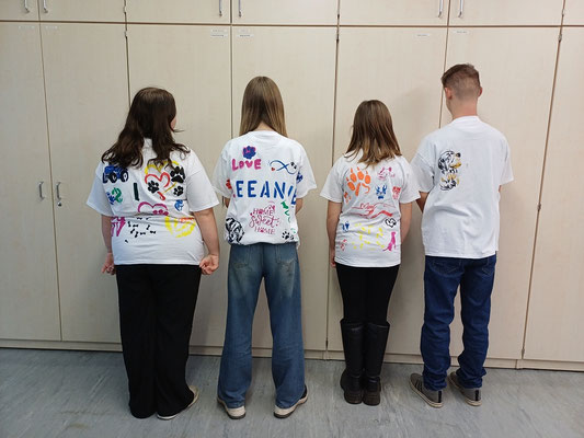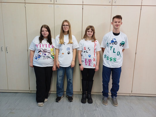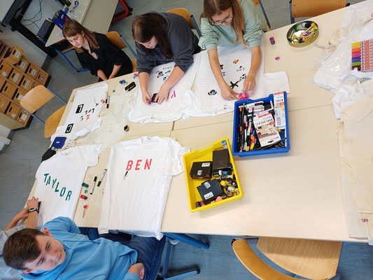 Einige Schülerinnen und Schüler der 5. , 6. und 7. Klasse bemalten nach eigenen Vorstellungen T-Shirts für sich selbst oder für ihre Geschwister.